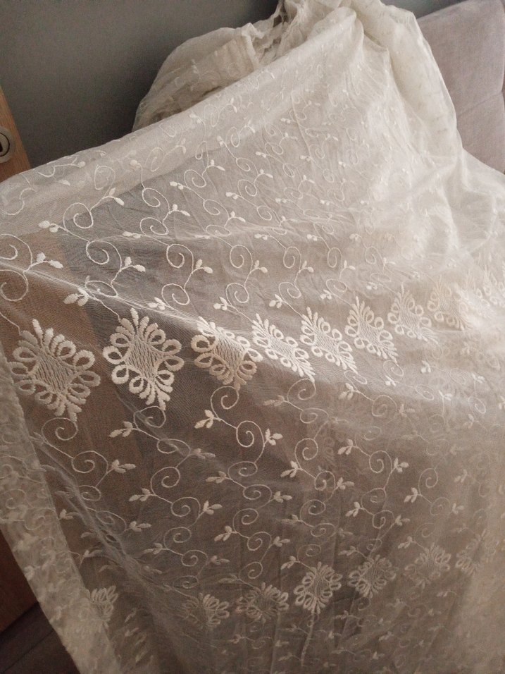 Hafif beyaz renkli, işlemeli bohem desenlere sahip, yumuşak ışık geçiren ince kumaştan tül perde. 3 metre uzunluğu kısa camlar için uygundur