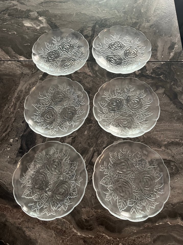Altı parçadan oluşan beyaz cam tabak seti, işlemeli çiçek desenleri ve klasik stil ile birlikte dalgalı kenarlara sahiptir. Kullanıldı. küçük tatlı servis tabağı