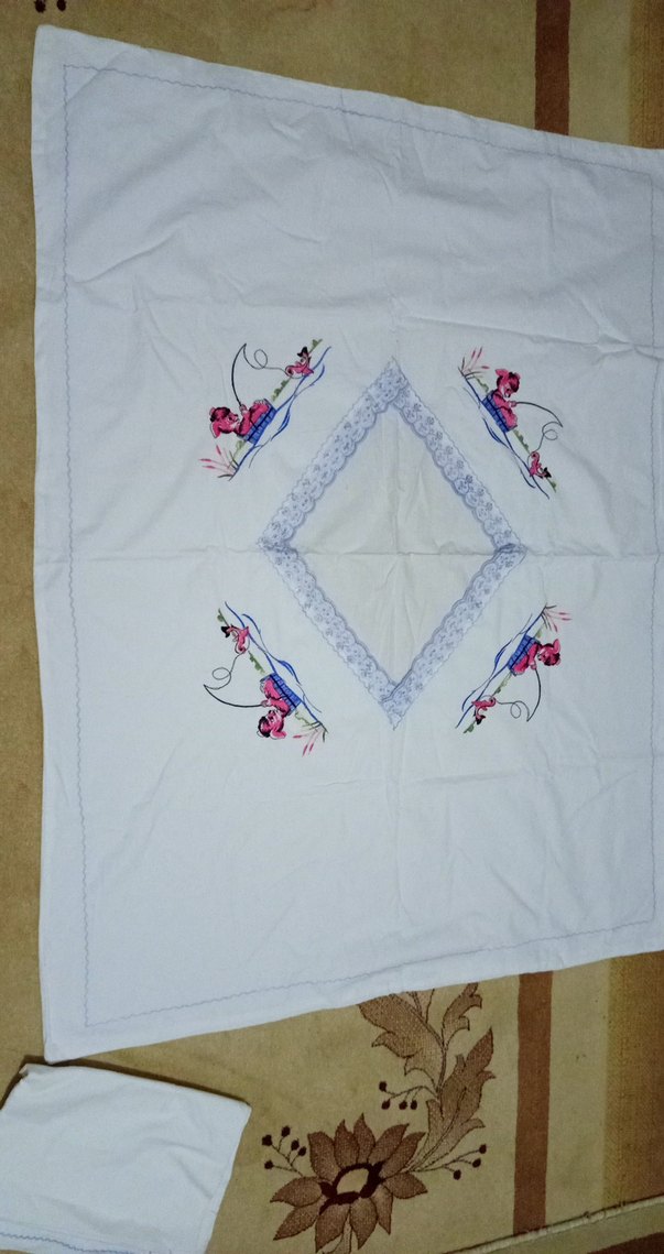 Açık beyaz renkte, işlemeli çiçek desenleri ve ortasında dantel elmas detayı bulunan geleneksel tarzda çocuk nevresim takımı 1 defa kullandım