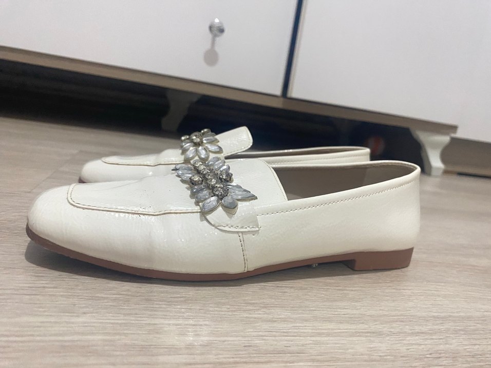 İşlemeli Beyaz Deri Tokalı Kadın rugan babet
