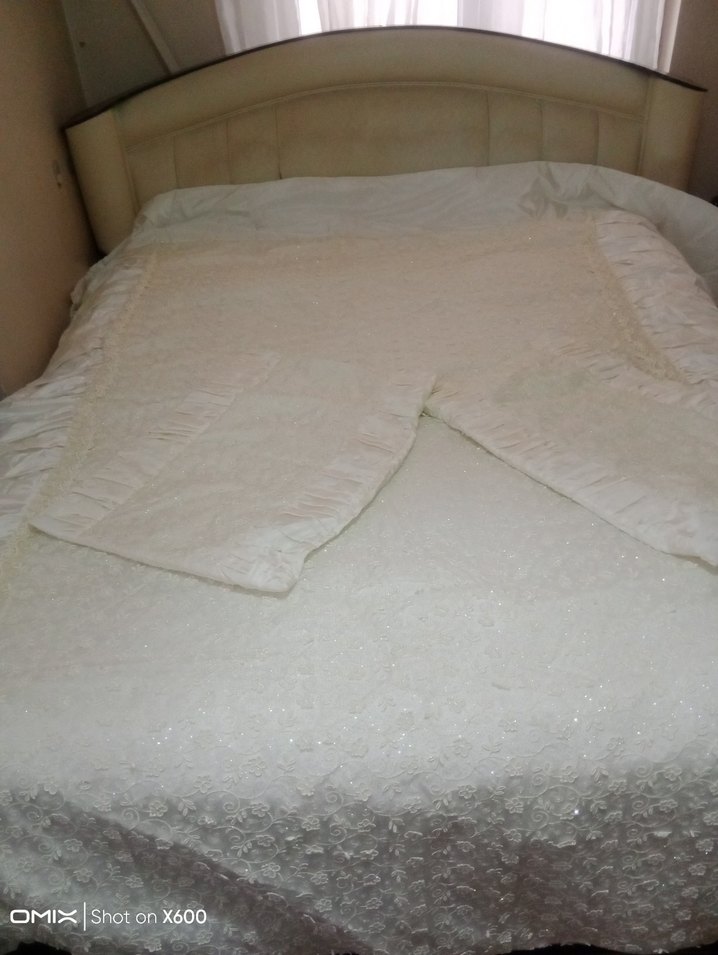 İşlemeli Beyaz ekru Parlak Yatak Örtüsü