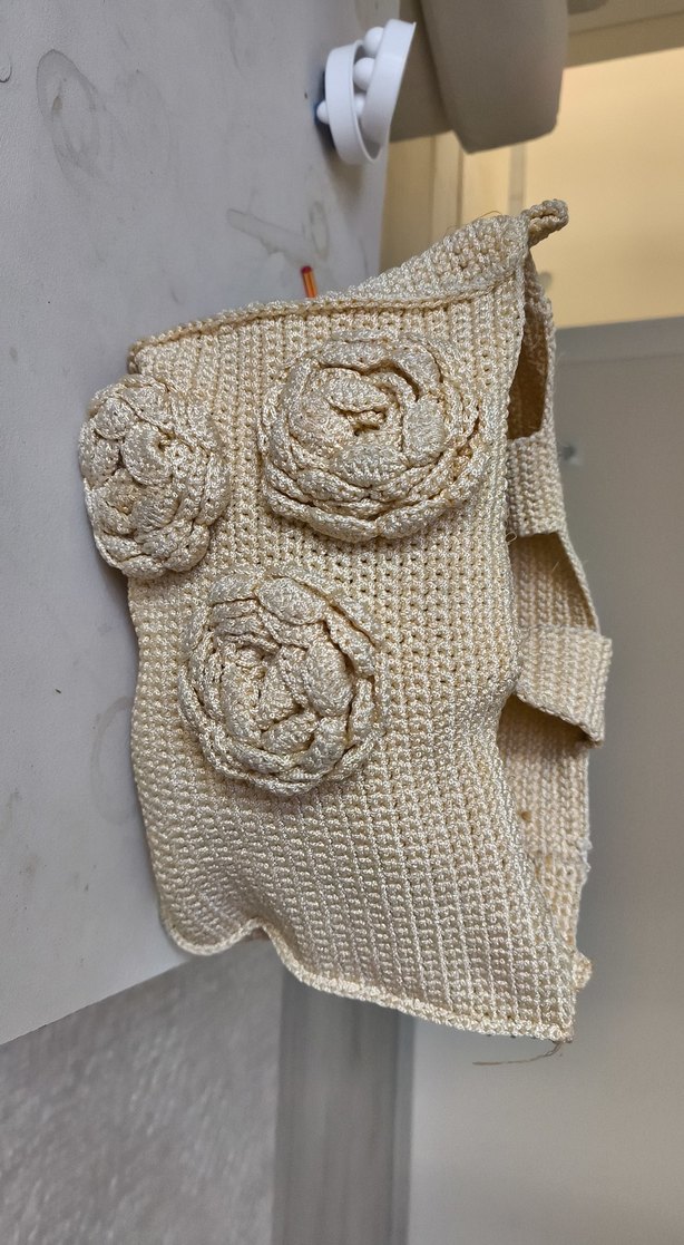 İşlemeli çiçek desenli, dokulu kumaştan yapılmış açık beyaz fırın eldiveni, asma halkası bulunur.