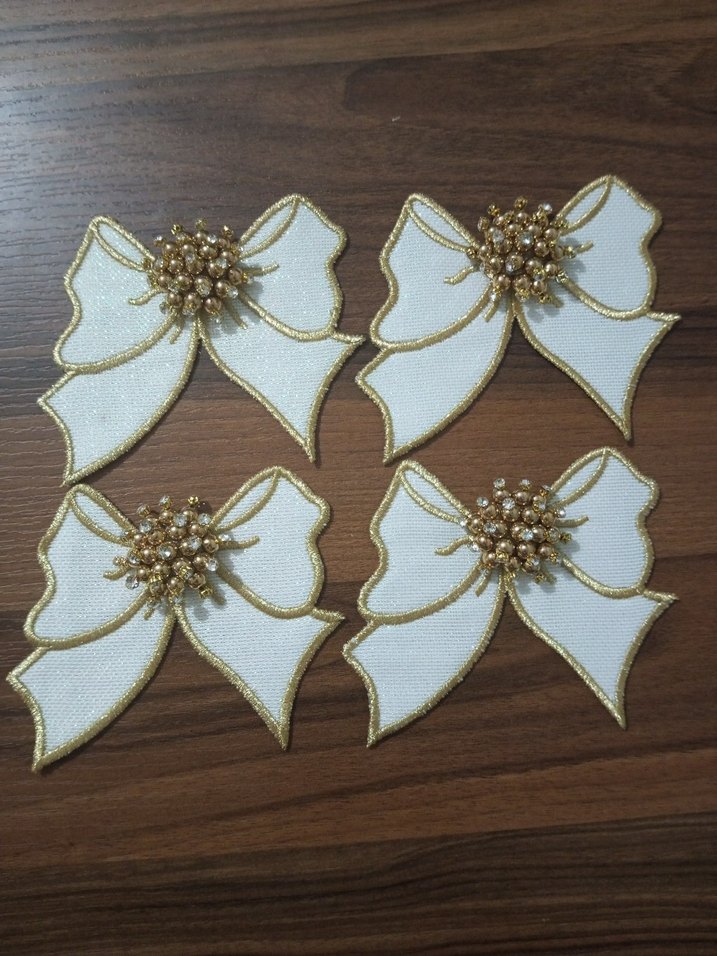 Düğünler için uygun, parlak altın boncuklu işlemeli beyaz fiyonk şeklinde dört adet vintage tarzda broş seti.