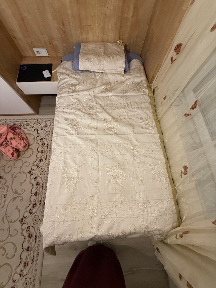 İşlemeli beyaz yatak örtüsü, hafif kumaş üzerinde zarif doku sağlar. Yatağı tamamen kaplar, sıcak bir yatak odası atmosferi yaratır. ️ tek kişilik sorunsuz az kullanılmış yeni gibisin