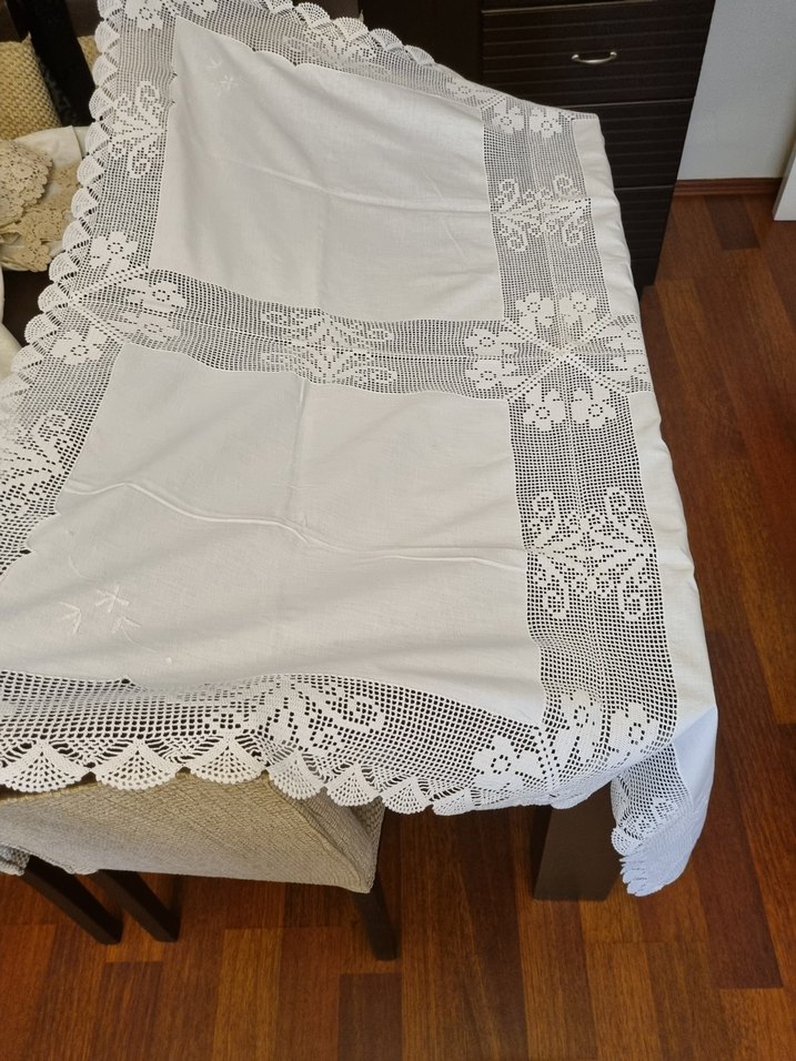 Geleneksel tarzda beyaz kumaş üzerine gri işlemeli desenler ve narin dantel kenarlarla süslenmiş masa örtüsü. Sofralara klasik bir dokunuş katar. ️
