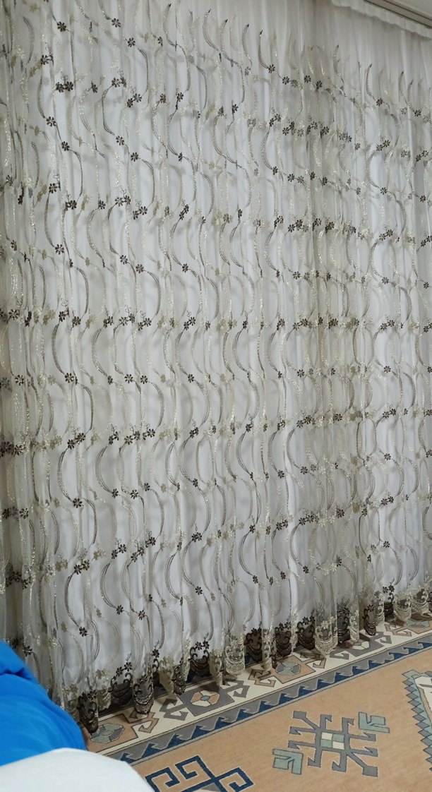 Brilllant Gold ve lacivert işlemeli tül en 4 metre boy 2,54 cm bir veya iki yerinde küçük hasar oldu çok küçük görünmüyor bulamadım harika bı tül kaçırmayın