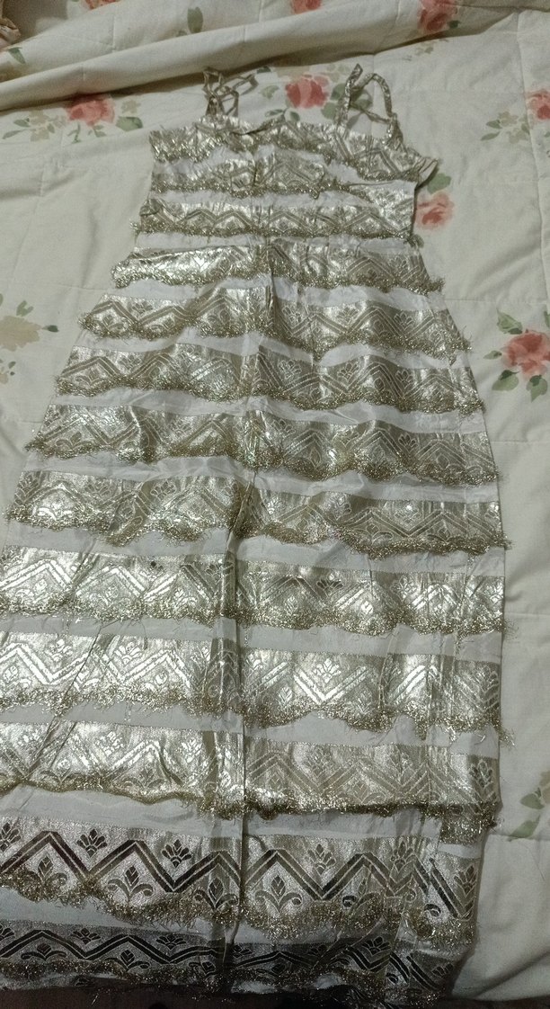 İşlemeli desenlere ve pilili detaylara sahip uzun kadın elbisesi.askılı kolludur, beyaz ve altın renklerde, düzenli kesimdir, düğün için uygundur. değişik bı kumaşı var arkadaşlar ne olduğunu bilmiyorum
