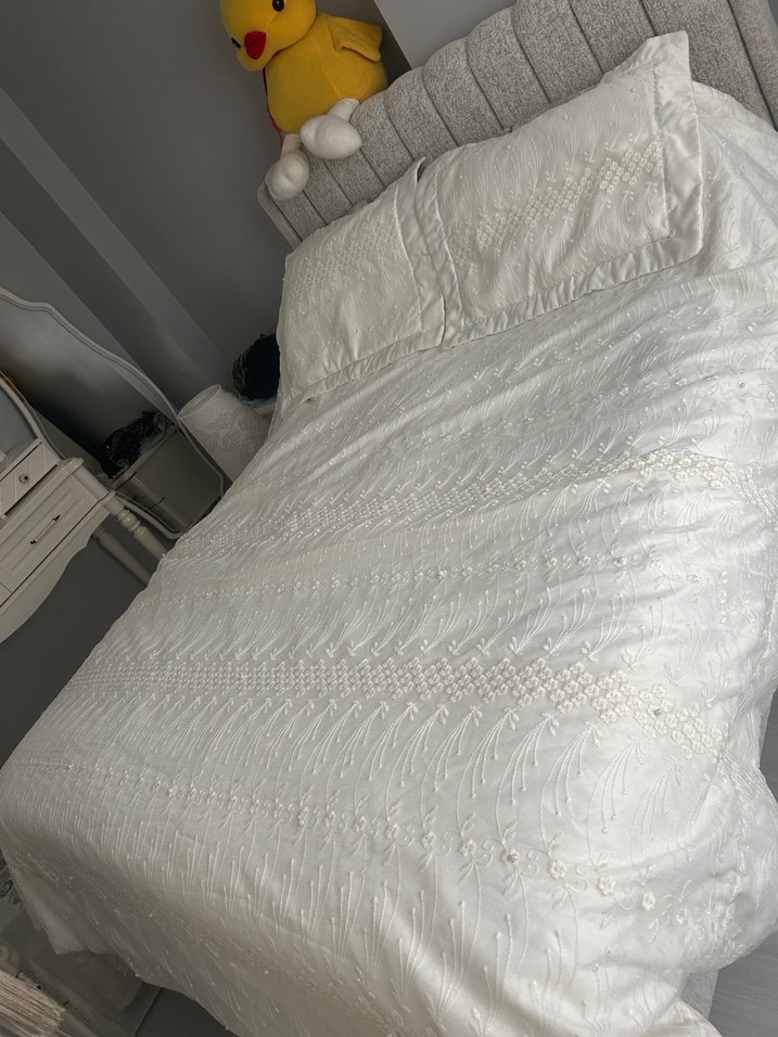 Yumuşak ve dokulu kumaş üzerinde ince gri işlemelerle beyaz yatak örtüsü. Aynı işlemeli desene sahip uyumlu yastık kılıfları içerir. ️çift kişilik sorunu yoktur