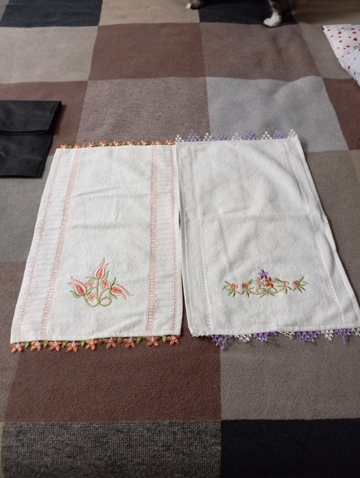 İki beyaz havlu, pastel renkli çiçek işlemeleri ve narin iğne oyası kenarlarla süslenmiştir. 2 adet.