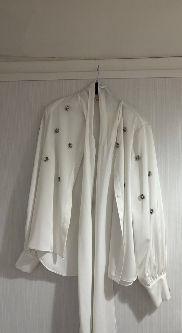 İşlemeli detaylara sahip, uzun paçalı beyaz gömlek. Düğmeli ve satenimsi kumaştan, uzun kollu ve rahat kesimdir, ofis için uygundur. ✨