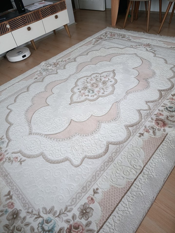 İşlemeli desenli, açık beyaz tonlarda klasik tarzda bir halıdır. Odaya yumuşak ve zarif bir hava katar.6 metrekare