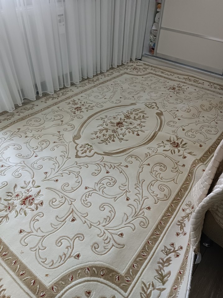 Hafif renkli, klasik tarzda işlemeli desenlere sahip beyaz halı, her odaya zarafet katıyor. merinos halı kalın yün kaliteli siyah lekesi alındığı takdirde yikatilip gönderilecektir az kullanıldı.6 metrekare