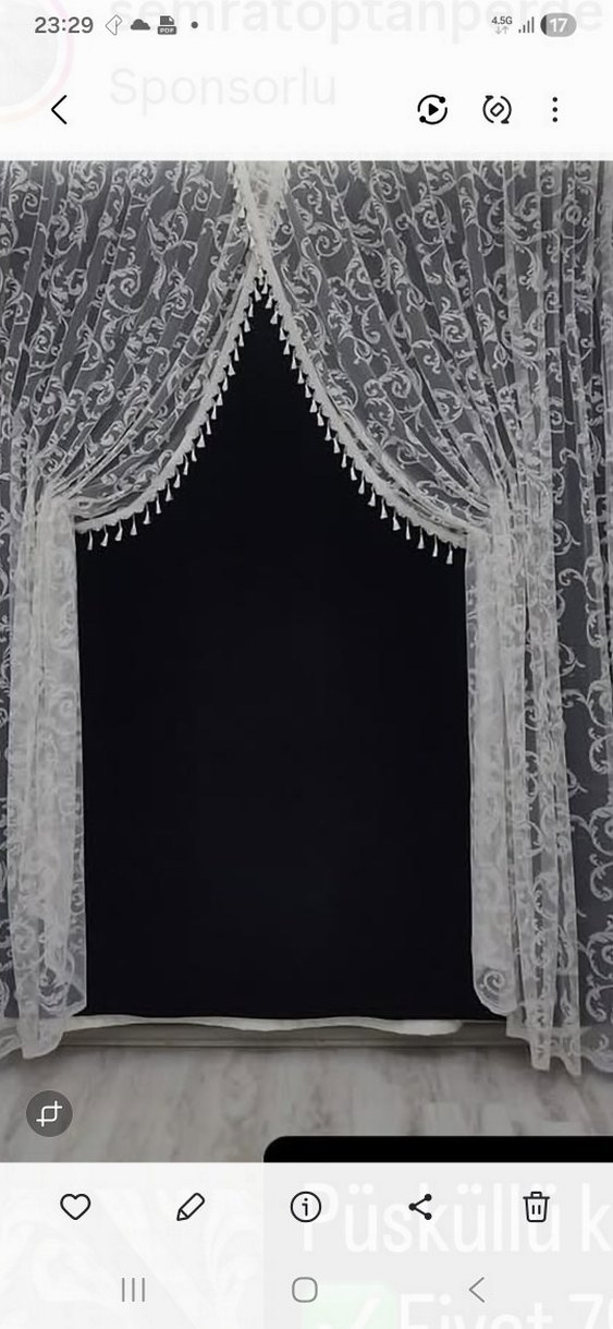 İşlemeli desenlere ve püskül detaylara sahip beyaz perde, klasik bir görünüm sunar.