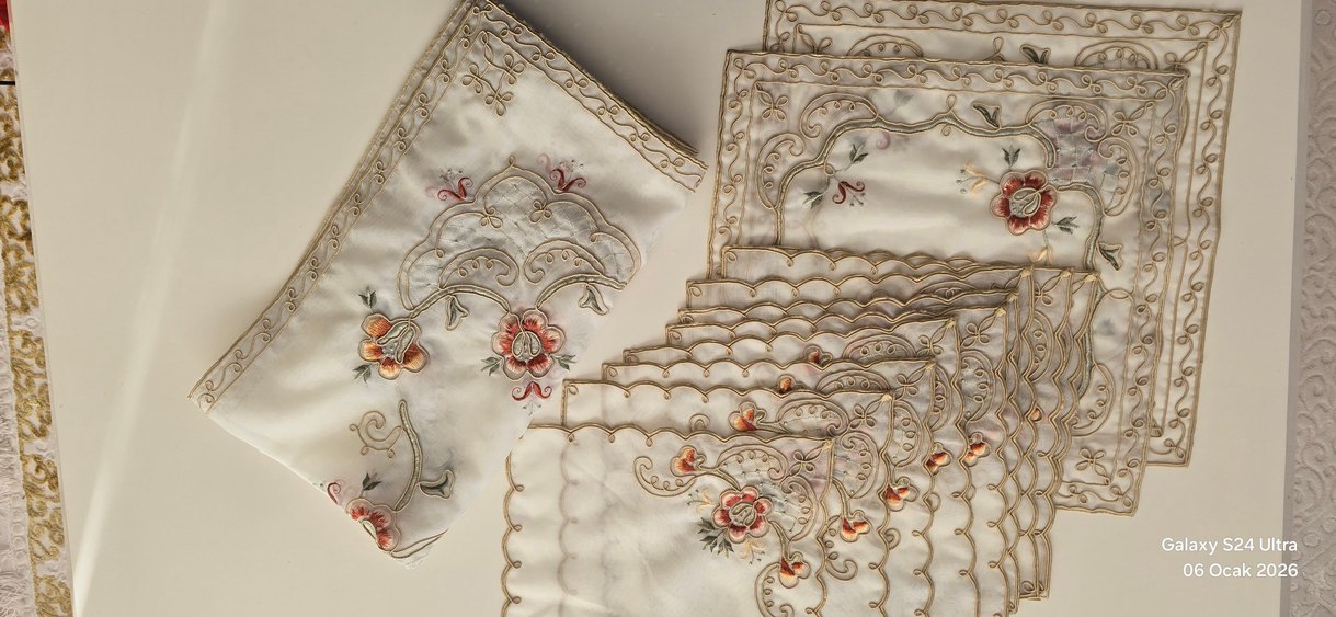 İşlemeli çiçek desenleri ve zarif dalgalı kenarlarıyla beyaz masa örtüsü, hafif ve şık detaylara sahip. 10 parça küçük peçetelik 2 parça sehpalık 1 parçada masa için örtü elbise işçiligi