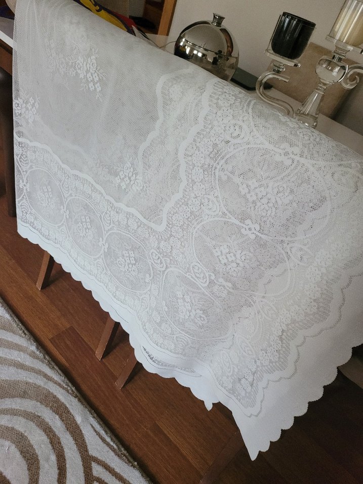 İşlemeli desenlere sahip beyaz masa örtüsü, geleneksel tarzıyla masanıza zarif bir dokunuş katar. Hafif ve şık görünür. ️