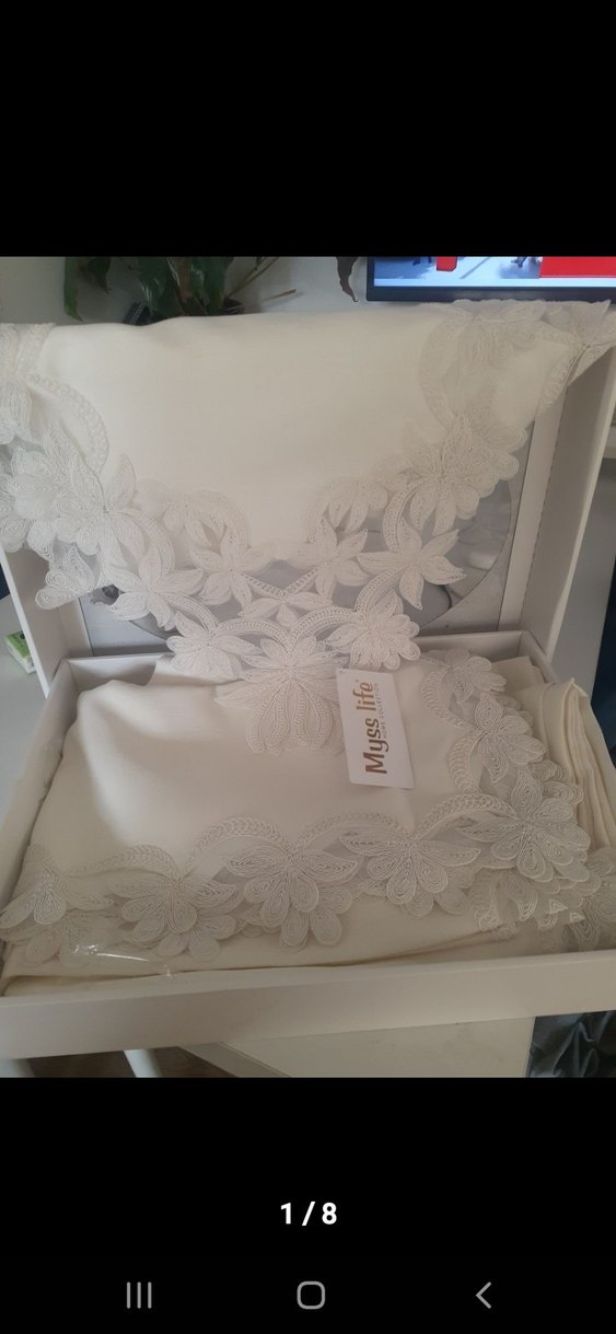 Kenarlarında zarif işlemeli çiçek desenleri bulunan beyaz masa örtüsü, geleneksel ve şık bir görünüm sunar. Yemek alanınıza ince bir şıklık katar.