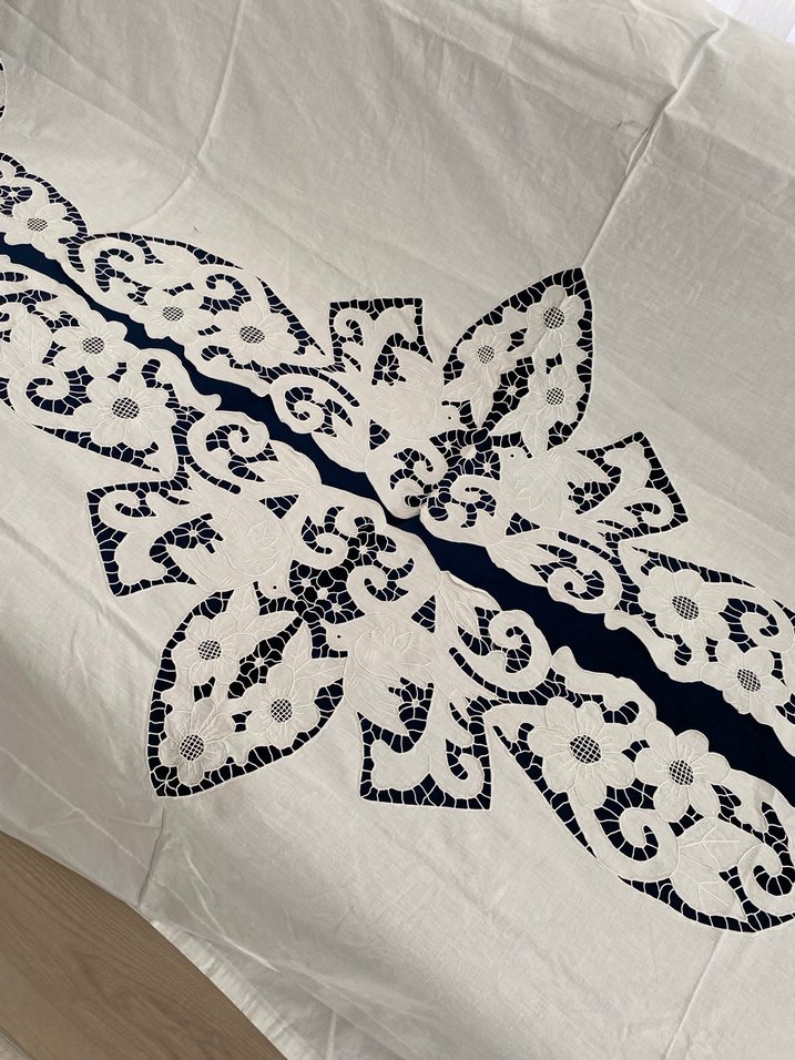 Koyu işlemeli desenlere sahip, geleneksel tarzda beyaz masa örtüsü, ayrıntılı kesme işi detaylarıyla.