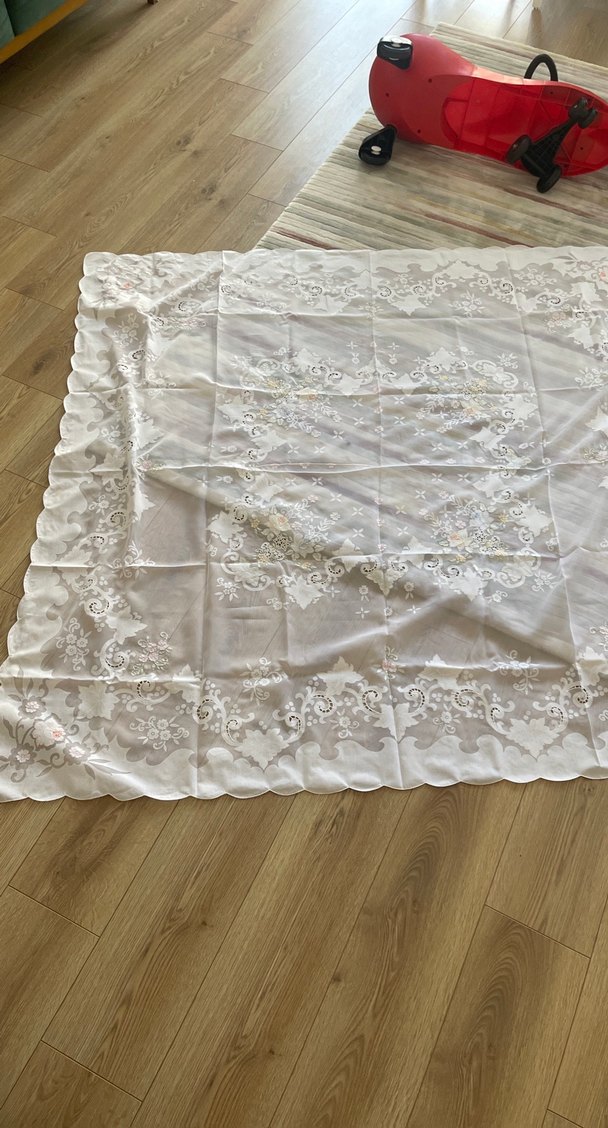 Beyaz masa örtüsü, işlemeli desenlere ve dalgalı kenarlara sahiptir. Hafif ve yumuşak kumaştan yapılmıştır. Geleneksel masa düzenleri için uygundur. ️hasarı lekesı yok hıc kullanılmadı