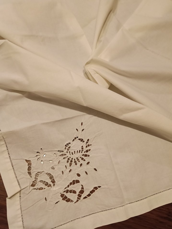 İşlemeli çiçek desenli, parlak beyaz renkte ve klasik tarzda masa örtüsü. Kenar olcusu 90 cm.