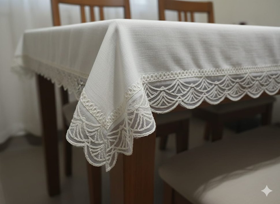 İşlemeli kenarları ve parlak beyaz rengiyle klasik tarzda masa örtüsü. ️