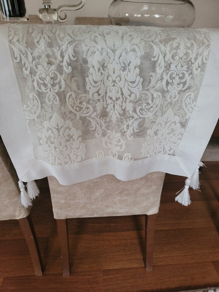 İşlemeli gri desenlere ve püskül detaylara sahip beyaz masa örtüsü veya klasik tasarımıyla çeşitli ortamlar için uygundur.