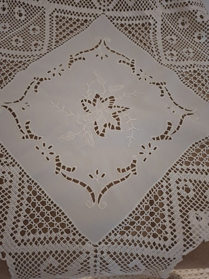 İşlemeli çiçek desenleri ve dantel kenarları bulunan beyaz masa örtüsü, geleneksel tasarıma sahiptir. Masanıza klasik bir dokunuş katar.