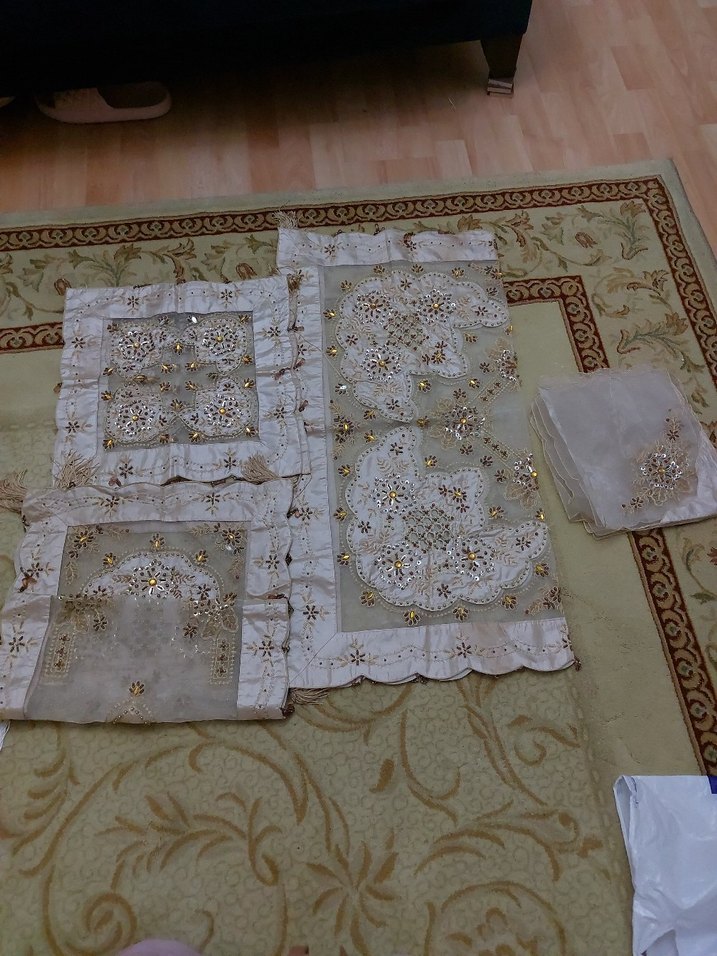 İşlemeli desenlere sahip açık kahve bej gibi masa örtüsü takımı, klasik tarzda zarif ve hafif renklerde detaylar içerir. Yemek alanınıza şıklık katar. ️14 parçadır