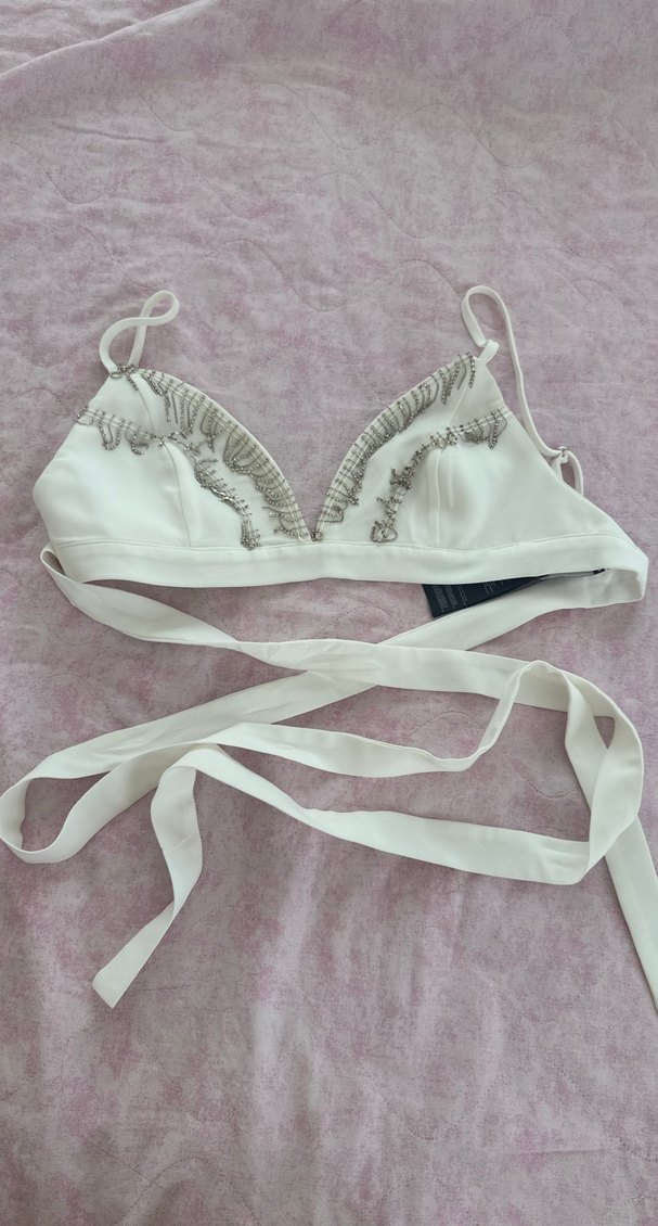İşlemeli detaylara sahip beyaz mini büstiyer, bohem Paris tarzını yansıtıyor. İnce askılı ve kısa boy tasarıma sahip. ✨