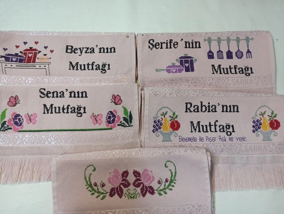 İşlemeli kişiye özel isimler ve çiçek desenleriyle süslenmiş açık renk beyaz mutfak havluları seti. Her havlu farklı mutfak adı içerir. ️