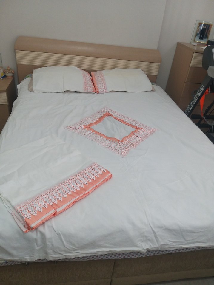 Hafif pembe işlemeli desenlere sahip beyaz yatak örtüsü ve uyumlu yastık kılıfları. Yumuşak ve şık kumaş, yatak odası için uygundur. ️çok az kullanılmış beklemekten sararmalar vardir son fiyattir