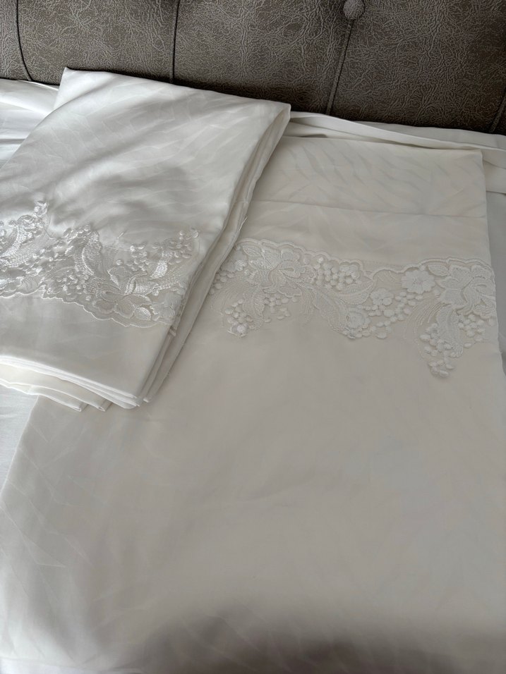 İnce işlemeli desenlere sahip beyaz nevresim ve çarşaf takımı, yatak odanıza zarif bir dokunuş katar.