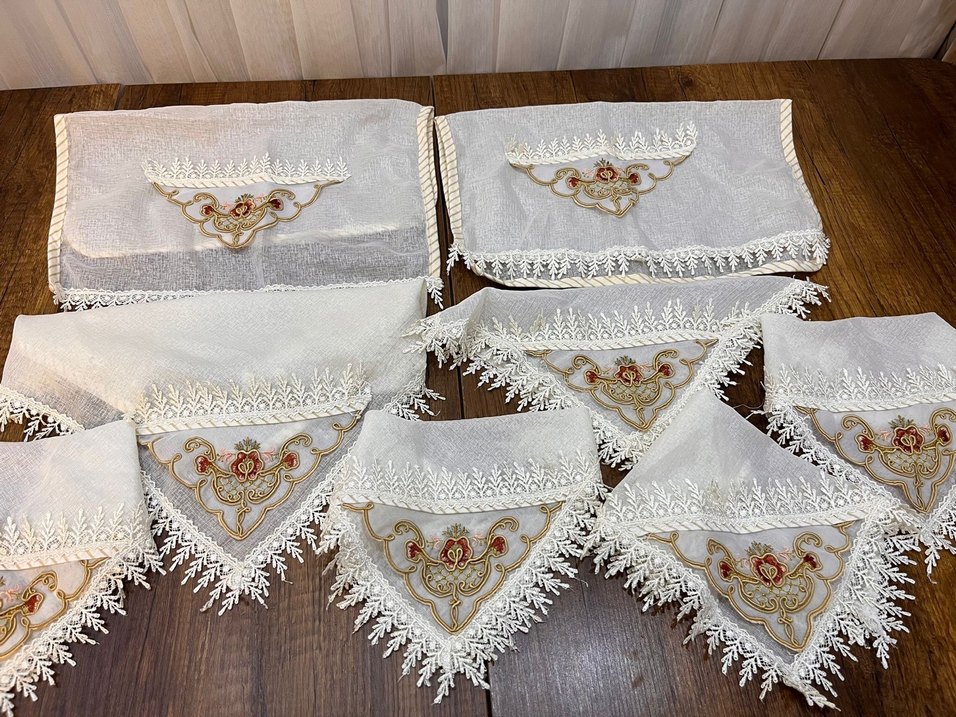 İşlemeli desenler ve zarif dantel kenarlarla süslenmiş beyaz örtüsü seti, geleneksel tarzda.