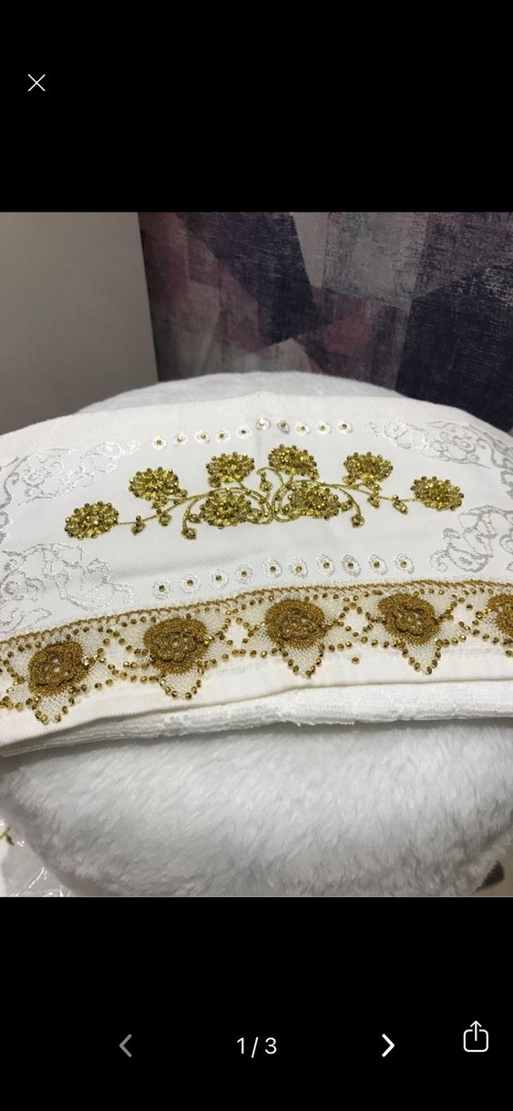 Parlak altın işlemeli çiçek desenlerine sahip beyaz havlu, klasik tasarımla. Yumuşak ve emici kumaşı günlük kullanıma uygun.