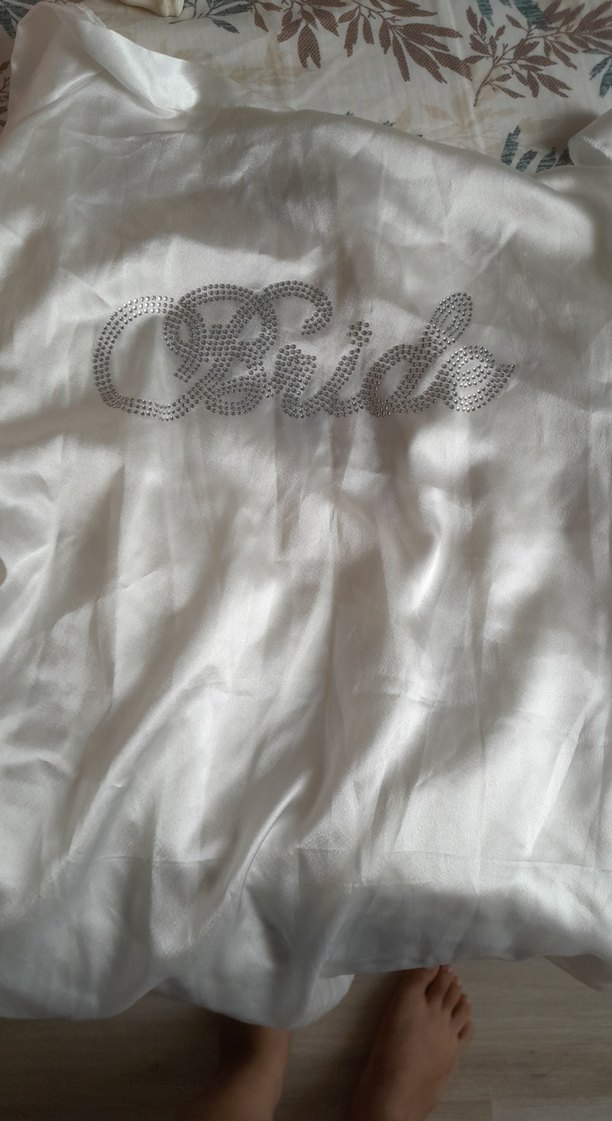 Beyaz, parlak ve işlemeli "Bride" detaylı, midi boy, bol kesim kadın sabahlık. 1 kere giyildi
