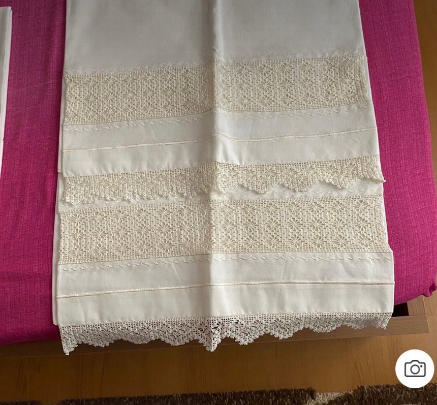 Parlak kumaş ve detaylı dantel kenarlarıyla işlemeli beyaz, geleneksel tarzda karyola takımı ✨