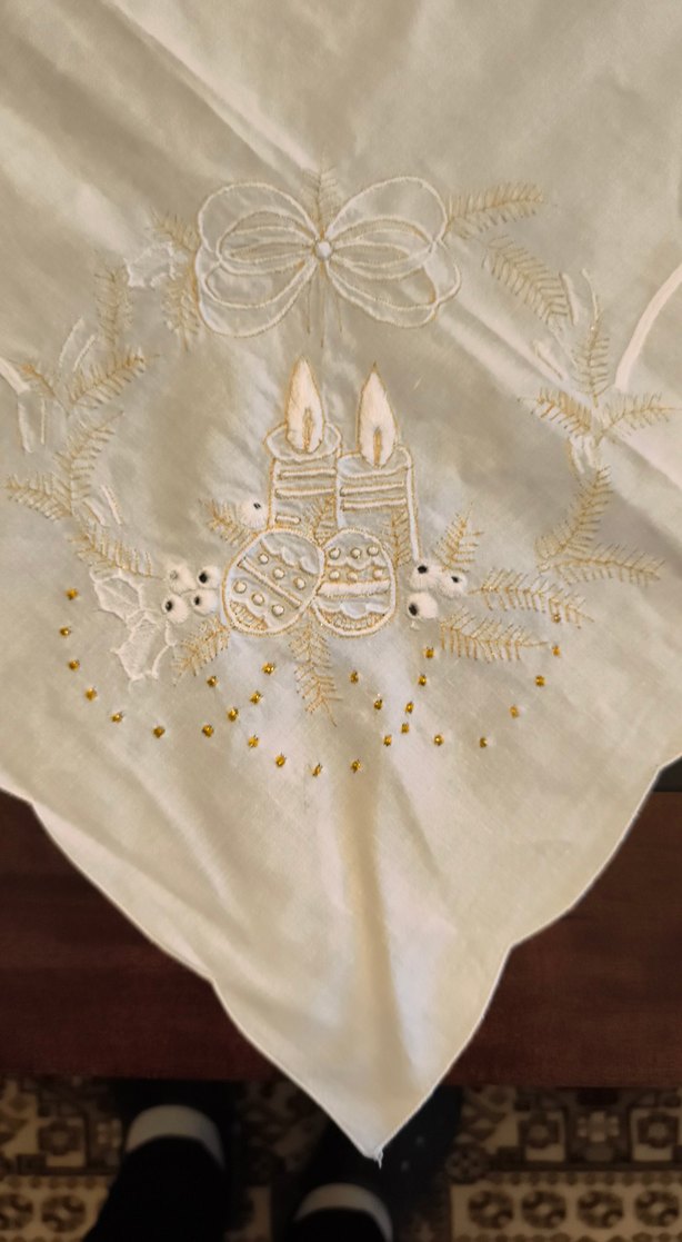 Bu beyaz masa örtüsü, parlak kumaş üzerine işlenmiş mum ve dekoratif detaylarla klasik bir dokunuş sunar. ️