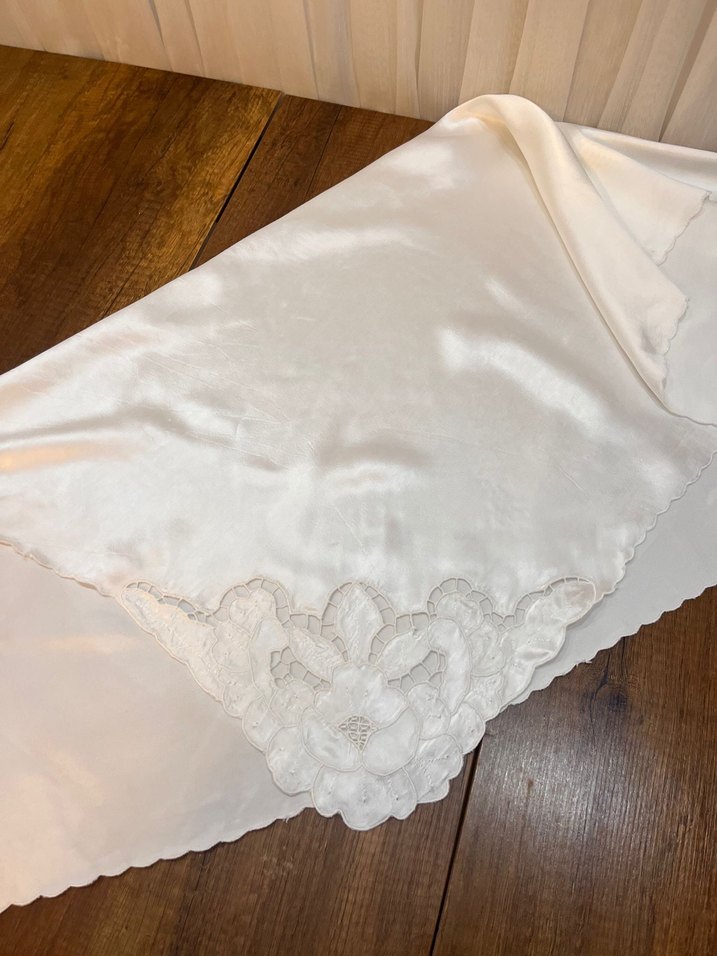 Parlak kumaştan, köşelerinde işlemeli çiçek desenleri bulunan beyaz masa örtüsü, klasik bir görünüm sunar.