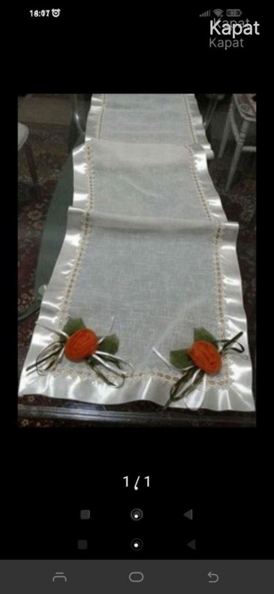 Beyaz masa örtüsü işlemeli detaylar ve parlak kenarlara sahiptir, turuncu çiçek süslemeleriyle tamamlanmıştır. Geleneksel tarzdadır.