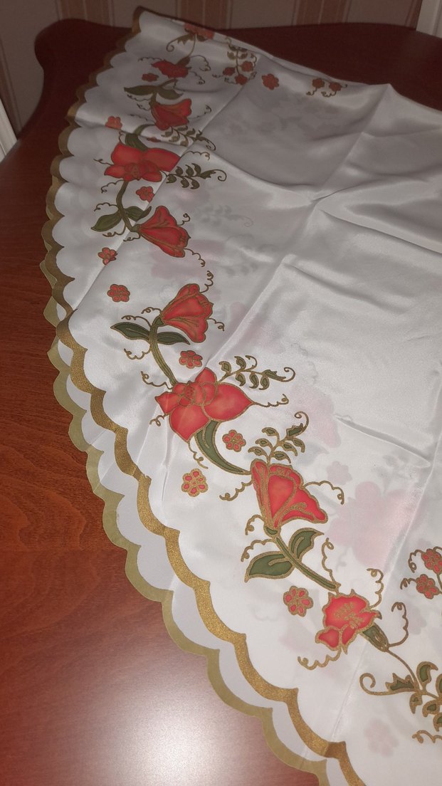 Beyaz masa örtüsü, işlemeli kırmızı çiçek desenleri ve parlak bir yüzeye sahiptir. Kenarları dalgalı olup geleneksel bir stile sahiptir.