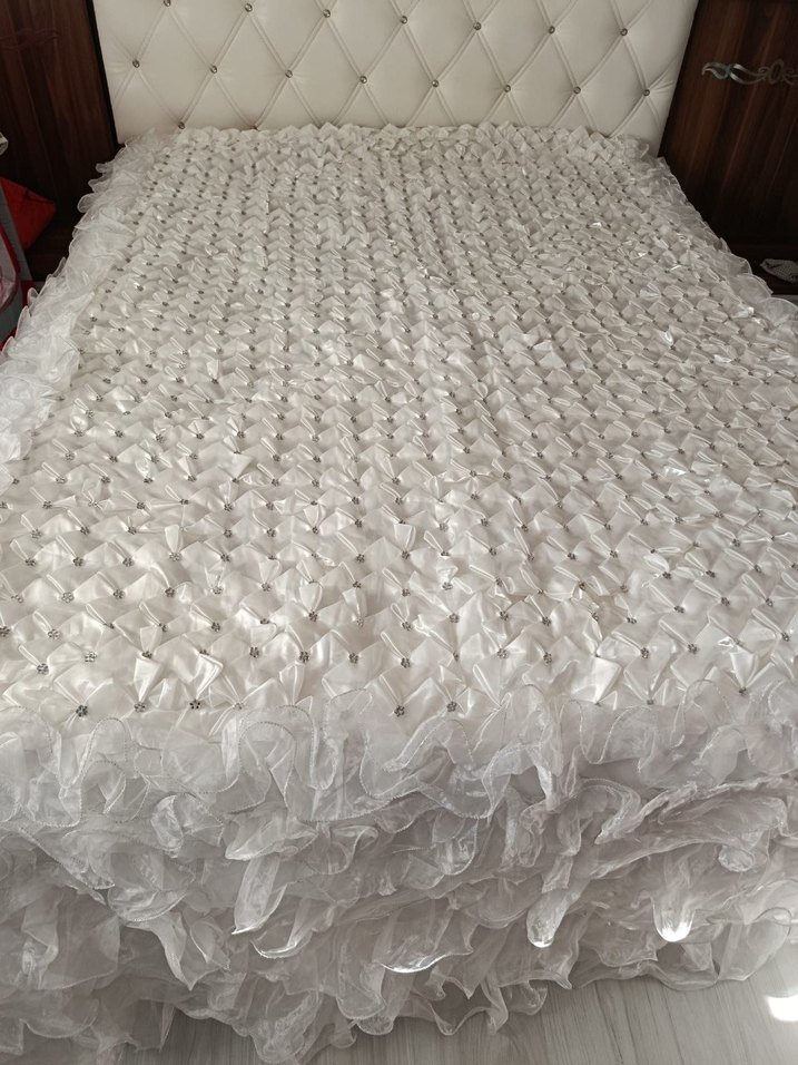 İşlemeli detaylara sahip parlak beyaz yatak örtüsü, katmanlı volanlarla dokulu bir görünüm sunar.iki yastigi vwr yatak olcusu 150 ye 200 ✨