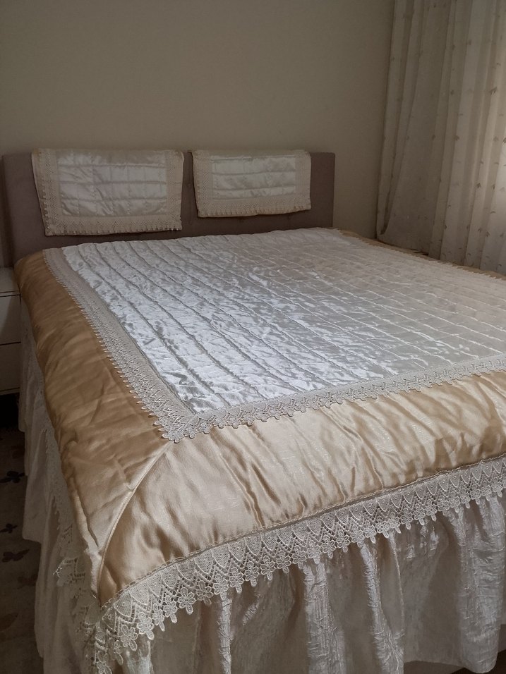 İşlemeli detaylara ve dantel süslemeye sahip, parlak beyaz yatak örtüsü. Yastık kılıfı dâhil, bir adet yastığın fermuarı bozuktur.
