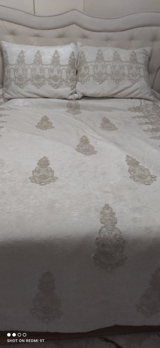 Parlak işlemeli desenlere sahip beyaz yatak örtüsü, yatak odanıza zarif bir hava katıyor. ✨