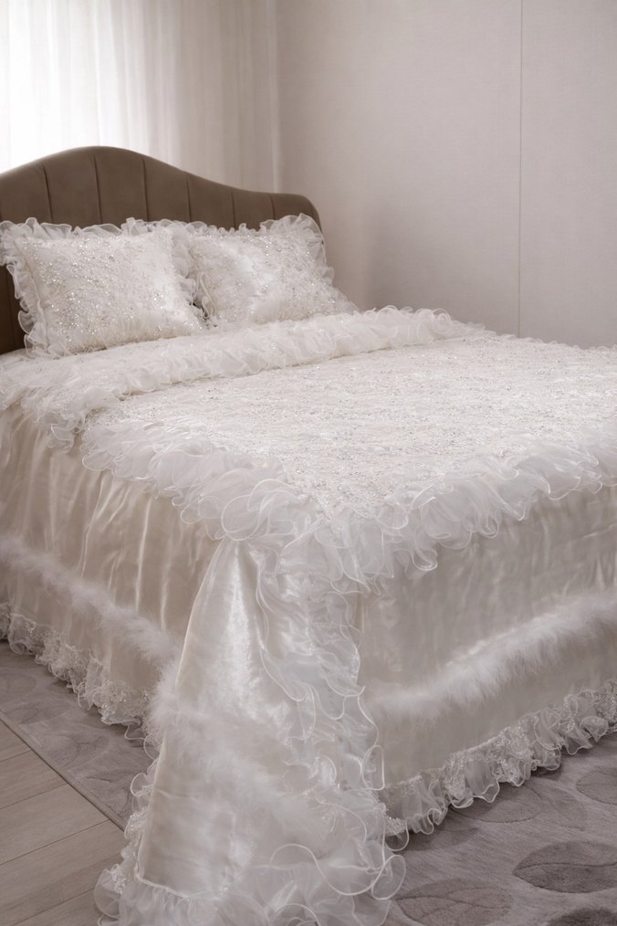 İşlemeli desenlere ve parlak görünüme sahip beyaz yatak örtüsü, zarif fırfırlı kenarlarla tamamlanmıştır. ️ Hediye geldi,kullanılmadı