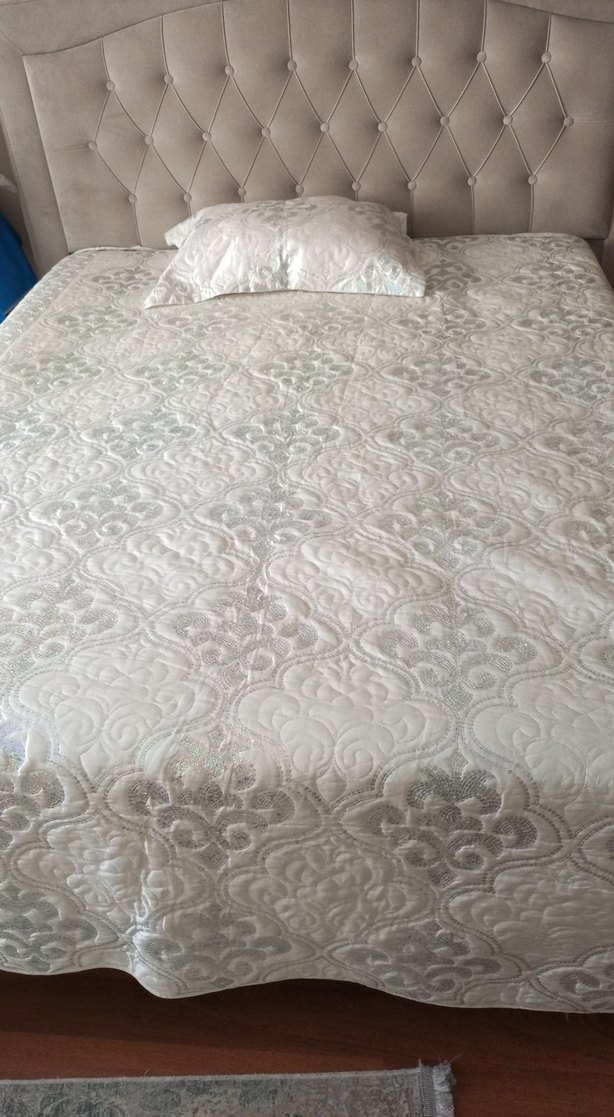 İşlemeli ve parlak desenlere sahip beyaz yatak örtüsü, yatak odasına zarif bir dokunuş katıyor. Üzerinde uyumlu yastık kılıfı bulunur. ️