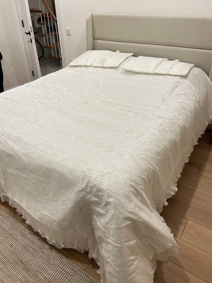 İşlemeli ve parlak beyaz yatak örtüsü, uyumlu yastık kılıfları ile beraber. Yatak odasına zarafet katar. Sayılı kullanıldı tertemizdir #gelinyatakörtüsü #gelinodası #işlemeliyatakörtüsü