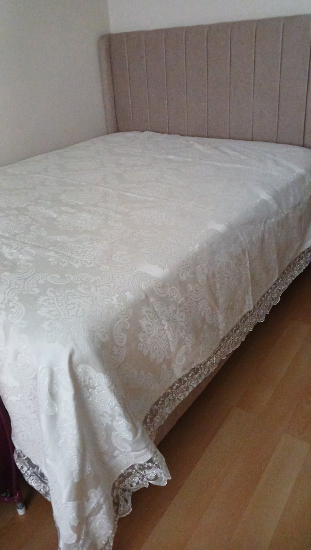 Parlak görünümlü, işlemeli ve dantel kenarlı beyaz yatak örtüsü, yatak odasına zarafet katar ️.