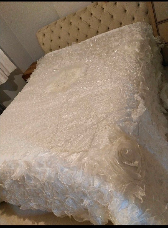 Parlak kumaş ve detaylı işlemelere sahip beyaz yatak örtüsü, zarif bir dokunuş için dekoratif çiçekli kenarlara sahiptir. ️