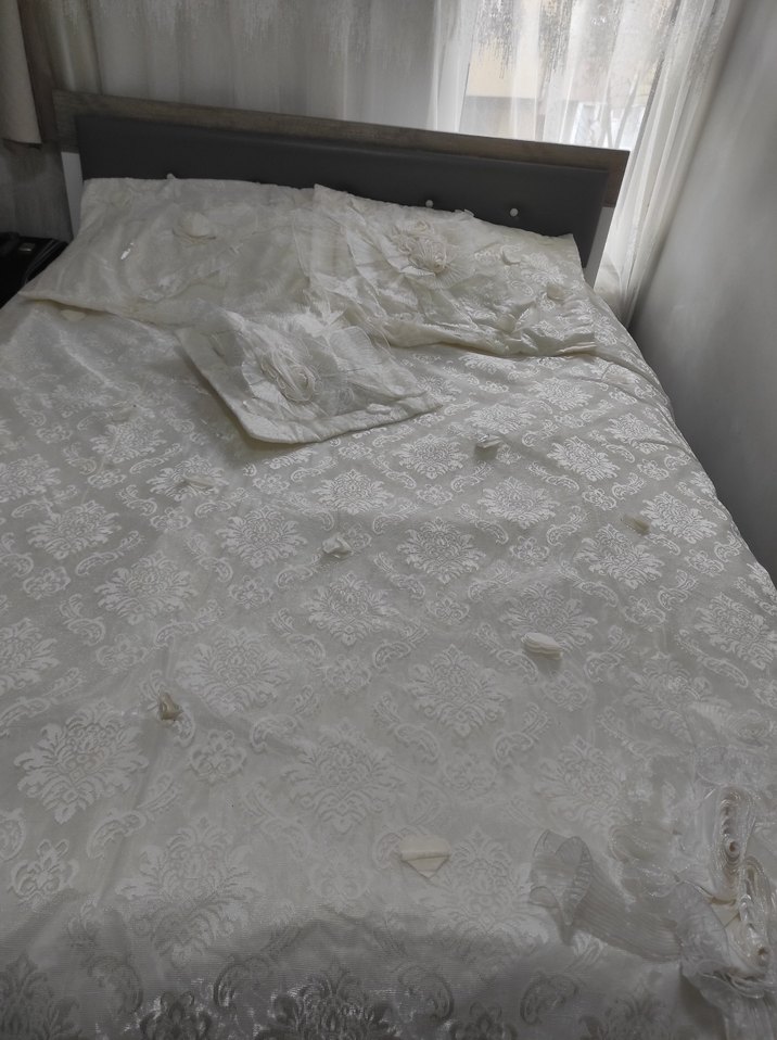 yatak örtüsü az kullanıldı 2 yerinde tül kısmında hafif yırtık var fotoğrafta var ama hiç belli olmuyor bazı yerlerde sararti var 1 örtü 2 yastık 1 tanede kırlenti var