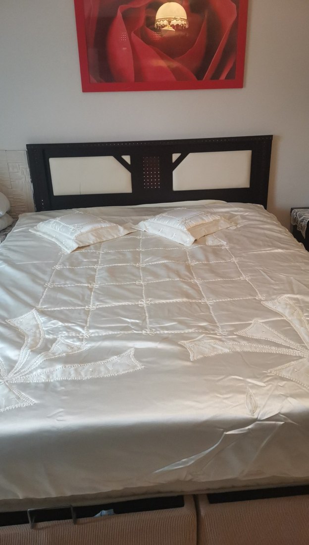 İşlemeli desenlere sahip, parlak beyaz yatak örtüsü, yatak odasına zarif bir dokunuş katıyor. ️