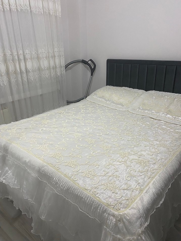 Parlak işlemeli beyaz yatak örtüsü, şık dokulu deseniyle yatak odasına zarif bir dokunuş katıyor. ️